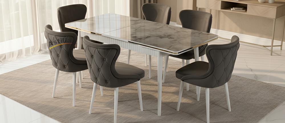kelebek masa kasalı gri mermer 80x130 5.800₺ tuna sandalye beyaz gri 3.600₺ 6 SANDALYELİ FİYATTIR